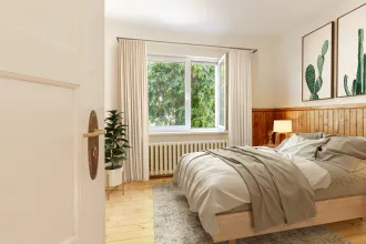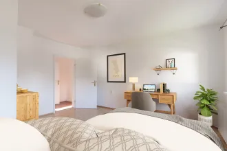 Durch die ebenerdig zum Sonnengarten hin gelegene, einladende Veranda gelangen Sie ins Hochparterre Ihres neuen Eigenheims. Dieses beherbergt ein großzügiges Wohnzimmer, ein Schlafzimmer, eine Küche und ein gefliestes Tageslicht-Wannenbad. Über die massive Vollholz-Treppe erreichen Sie das Obergeschoss mit zwei weiteren Schlafzimmern, einer kleinen Küche sowie einem Tageslicht-Wannenbad. Der Dachboden bietet zusätzliches Ausbaupotenzial. Das Highlight des Hauses ist zweifellos der hinter dem Haus liegende Süd-Garten mit altem Baumbestand. Hier können Sie Ihre Privatsphäre und Ruhe in vollen Zügen genießen – der Garten ist nicht einsehbar und lädt zum Entspannen und Verweilen mit Familie und Freunden ein.
