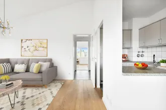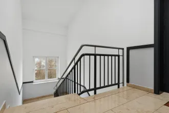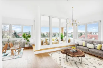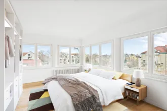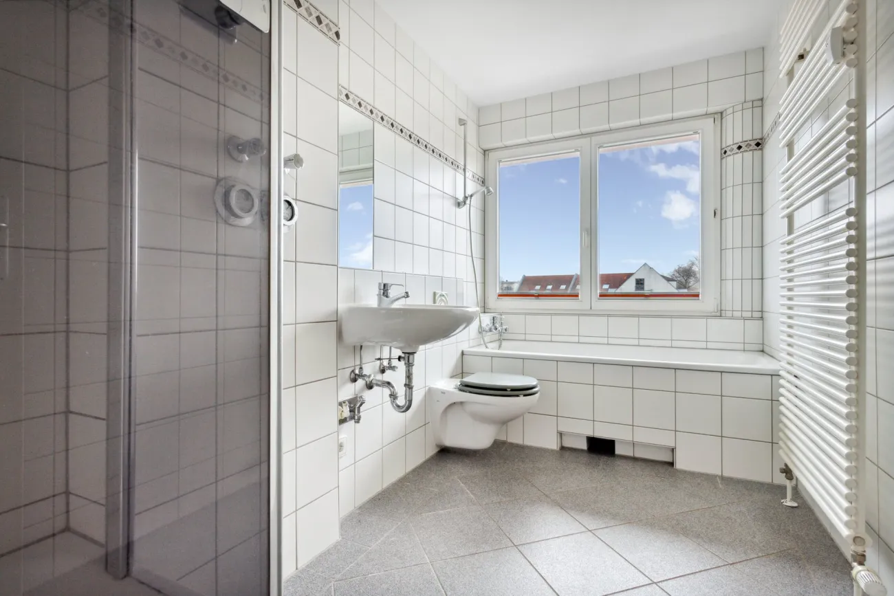 Über das gepflegte Treppenhaus erreichen Sie die im Dachgeschoss gelegene, lichtdurchflutete Eigentumswohnung mit beeindruckend weitem Blick über die Dächer Niederschönhausens. Die zirka 67 Quadratmeter Wohnfläche verteilen sich optimal auf zwei großzügig zugeschnittene Zimmer, eine Loggia, einen Flur sowie ein Tageslicht-Badezimmer mit Wanne & Dusche. Das Badezimmer sowie der Flur sind zeitlos mit ansprechend dunklen Fliesen ausgelegt. Die Zimmer selbst bestechen durch hochwertige Echtholz-Dielen im Landhausstil.