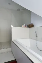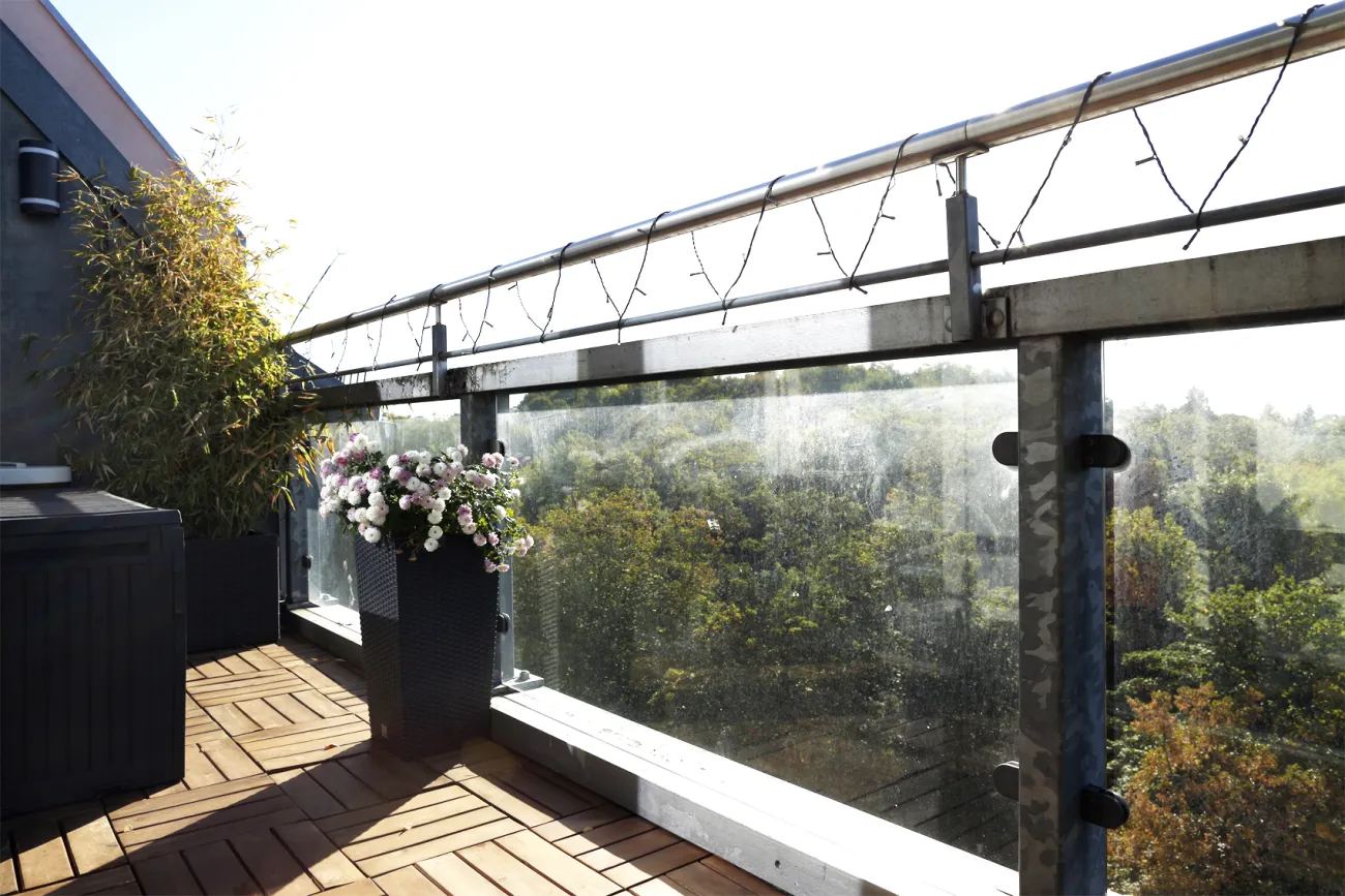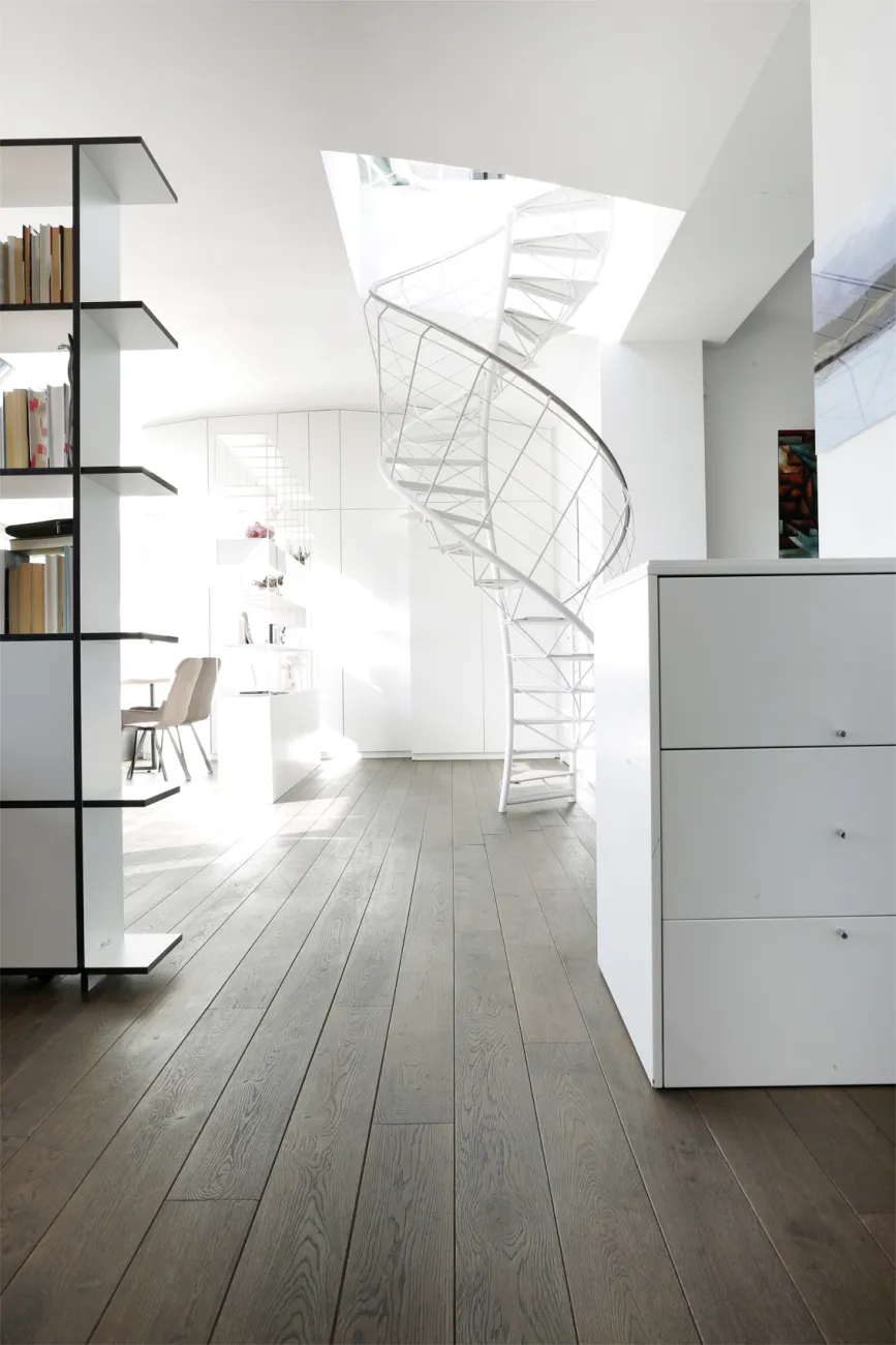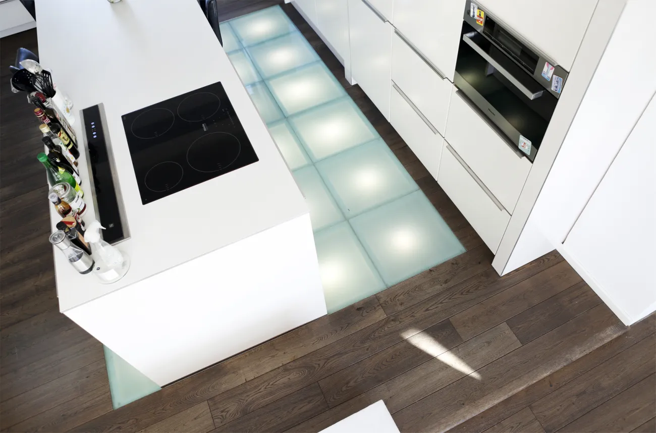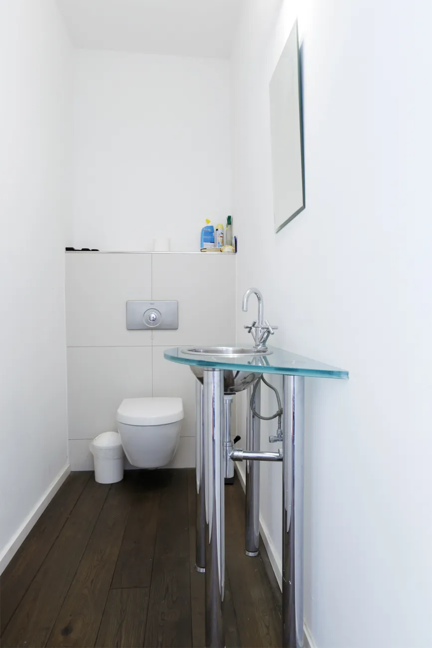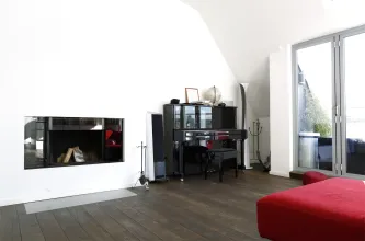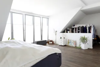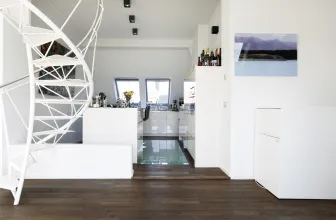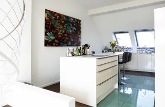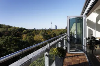 Die Perfektion dieser Immobilie zeigt sich weiterhin in der barrierefreien Ausstattung mit Vollholz-Eichenparkett, der Fußbodenheizung sowie einem Gäste-WC. Die luftige Raumhöhe von bis zu 3,30 Meter erlaubt ein besonders angenehmes Raumgefühl. Der Zuschnitt der Eigentumswohnung eignet sich derzeit hervorragend für 2 Personen, kann jedoch problemlos in eine 4-Zimmer-Wohnung umgestaltet werden. Die platzsparende und sich perfekt einfügende Wendeltreppe führt Sie auf die 60 Quadratmeter große Dachterrasse mit atemberaubendem Blick über Berlin. Über den mit einer wellenartig angelegten, blauen Glasbausteinwand ausgestatteten Flur gelangen Sie in Ihr Schlafzimmer mit Bad en Suite mit Badewanne, Dusche und einem beeindruckenden Whirlpool. An das Schlafzimmer grenzt ein weiteres Zimmer, welches sich hervorragend als begehbarer Kleiderschrank oder Wäschekammer eignet. Ein Waschmaschinenanschluss ist vorhanden. Die Fenster im gesamten Penthouse sind bodentief und werden durch Oberlichter ergänzt.