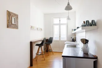 Der offen gestaltete Eingangsbereich der Eigentumswohnung versprüht sofort ein ausgesprochen behagliches Wohngefühl und offenbart sofort die atemberaubenden Lichtverhältnisse dieser Eigentumswohnung. Die großzügig angelegten und pragmatisch zugeschnittenen, gut 88 Quadratmeter Wohnfläche verteilen sich auf insgesamt 3 Schlafzimmer, einem Wohnzimmer sowie einer Wohnküche mit direktem Zugang zu dem nach Süd-Westen ausgerichteten und idyllischen Innenhof gelegenen Balkon. Zwei der Schlafzimmer sowie das zeitlos geflieste Tageslicht-Wannenbad mit Waschmaschinenanschluss sind ebenfalls nach Süd-Westen ausgerichtet. Das Wohnzimmer ist - raffiniert verbunden mit dem dritten  Schlafzimmer - besticht durch den weiten Blick über den beliebten Humannplatz mit all seinen Annehmlichkeiten. Darüber hinaus erlaubt die luftige Deckenhöhe von knapp drei Meter ein besonders angenehmes Raumgefühl. Die gesamte Immobilie – bis auf das Bad - ist mit originalen Dielen aus den 30er Jahren ausgelegt. Die Wände sind zeitgemäß verputzt und die Holzfenster und -türen in einem guten Zustand.