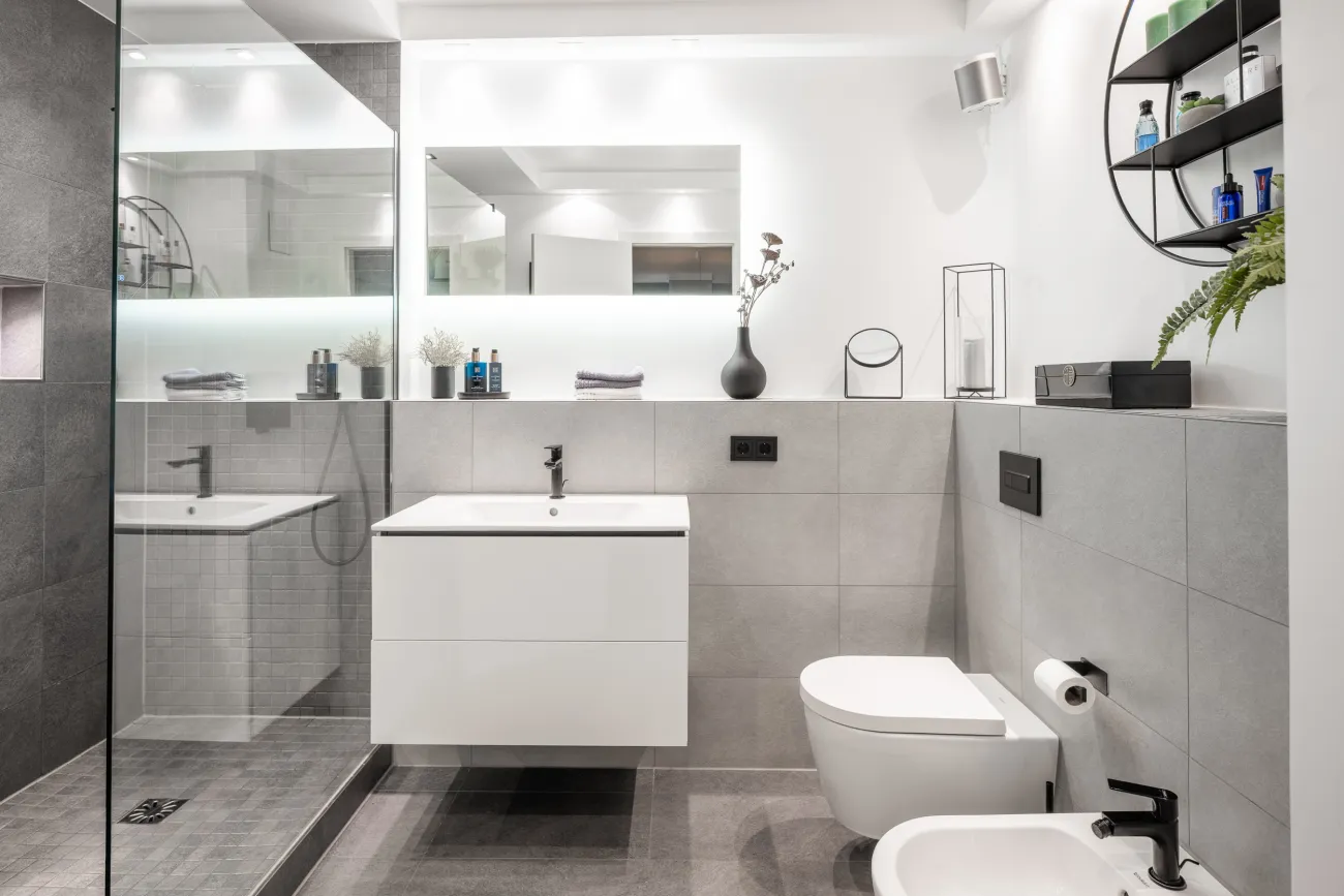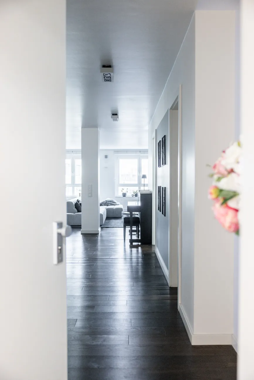 Der private Bereich überzeugt mit separater Ankleide und maßgefertigtem Einbauschrank im Schlafzimmer. Zwei Badezimmer, beide mit Dusche ausgestattet, bieten hohen Komfort und eine klare, moderne Gestaltung. Das Masterbad wurde 2023 vollständig erneuert und mit hochwertigen Sanitärobjekten von Duravit sowie Armaturen von Hansgrohe ausgestattet.