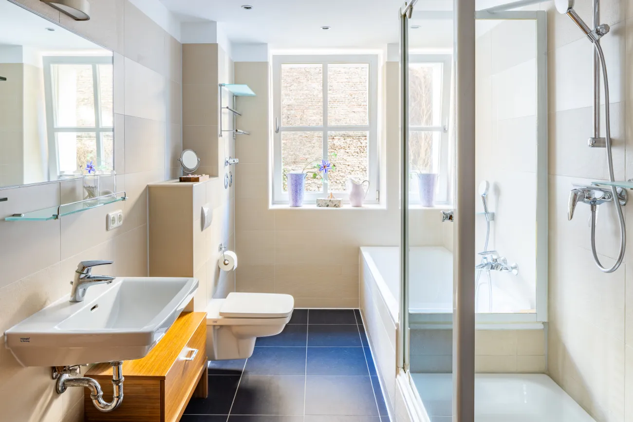 Das großzügige Tageslichtbad ist komfortabel ausgestattet und verfügt sowohl über eine Badewanne als auch über eine separate Dusche. Ein Waschmaschinenanschluss ist ebenfalls vorhanden und ergänzt die praktische Ausstattung der Wohnung.