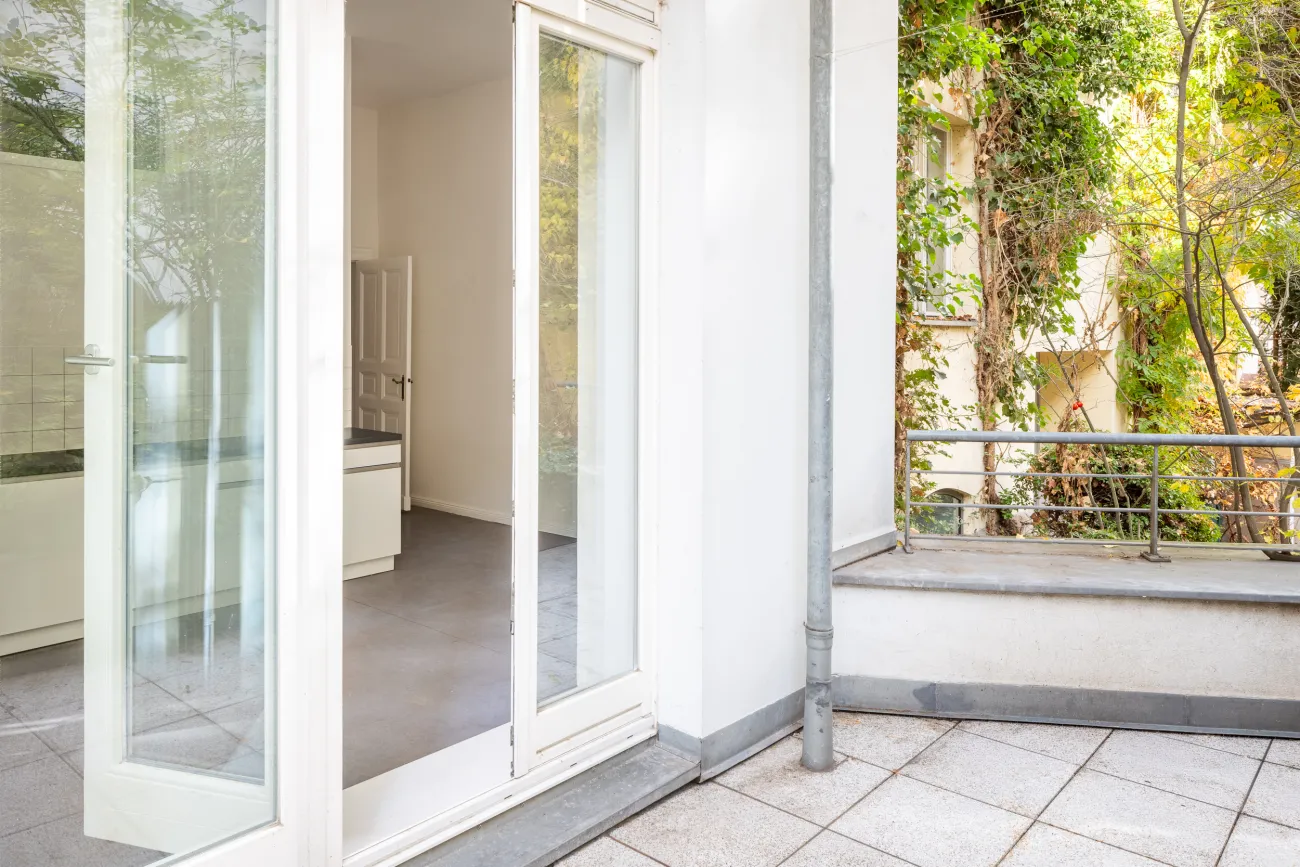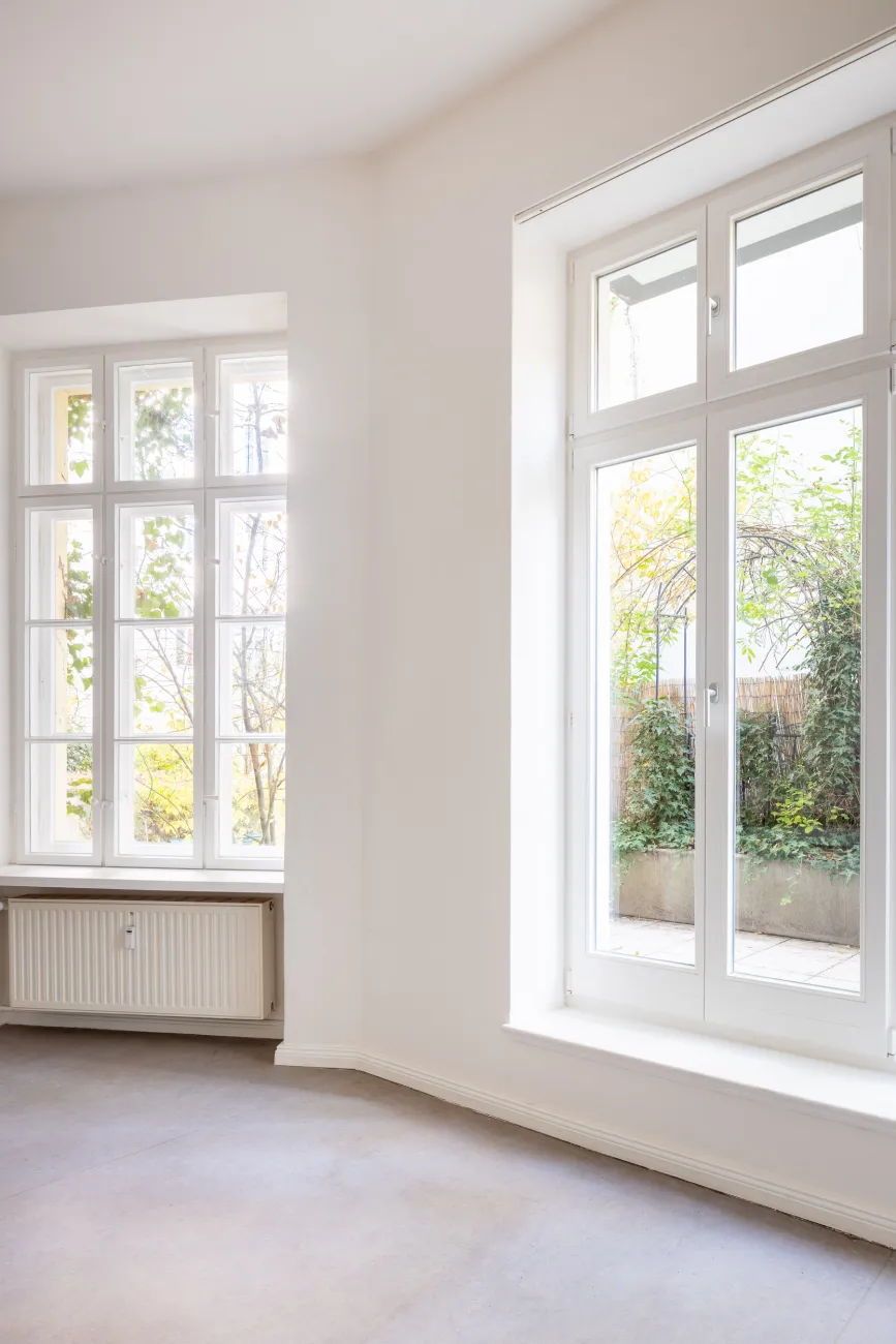 Auf rund 92 m² Wohnfläche vereint sie den unverwechselbaren Charme der Gründerzeit mit modernem Wohnkomfort. Bereits das großzügige Entree vermittelt ein Gefühl von Weite und Eleganz. Sternförmig angelegt gelangen Sie von hier aus in jedes der Zimmer dieser Immobilie. Die Wohnung verfügt über zwei großzügige, helle Zimmer, die durch eine elegante Flügeltür miteinander verbunden sind, sowie eine Wohnküche und Kammer. Diese klassische Raumaufteilung in Kombination mit den historischen Altbauelementen wie 3,70 Meter hohe Decken, originale Dielenböden, Flügeltüren und große Doppelfenster prägen das klassische Altbauambiente und schaffen eine ganz besonders lichte, repräsentative Wohnatmosphäre. Das Herzstück der Wohnung bildet die ausgesprochen großzügige Wohnküche mit einer hochwertigen Nolte-Küche, bodentiefen Fenstern und direktem Zugang zur rund 10 m² großen Terrasse. Von hier öffnet sich der Blick in den wunderschönen Innenhof mit seiner historischen Remise und den liebevoll sanierten, ehemaligen Pferdeställen, die heute als Fahrradschuppen genutzt werden. Zudem verfügt der Innenhof über ein angelegtes Wasserbecken, um die Luftfeuchtigkeit zu verbessern. Der Hof bietet eine grüne, ruhige Oase mitten in der Stadt.